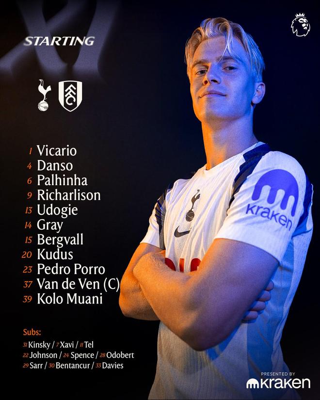 热刺首发:1-维卡里奥、23-波罗、4-丹索、37-范德芬、13-乌多基、6-帕利尼亚、14-阿奇-格雷、15-贝里瓦尔、20-库杜斯、9-里沙利松、39-穆阿尼